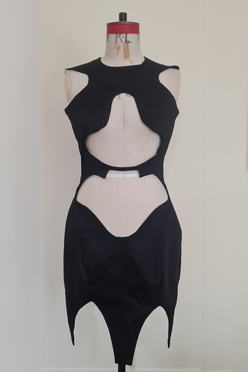 The collection silhouette is based around the hourglass shape, trying to achieve it through different distortions of the volumes. It investigates the traditional use of tailored suits and corsets and refashions them to break out of the traditional gender binary. She also uses prints and embroidery as a protest act, with decorative ‘flowers’ woven through with homophobic and transphobic newspaper headlines.